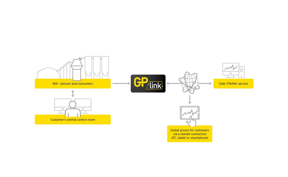 GPlink gives access to the existing sensors of your plant and transmits the data of your mill and consumers to our cloud. From our cloud you can easily access your operating data at any time and keep an eye on everything, even from your mobile device. Should you ever need support, your Pfeiffer experts can simply connect to your system and thus have the opportunity to support you without any loss of time or travel expenses and to help you, for example, in case of an unplanned stop.